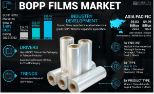二軸延伸ポリプロピレン(BOPP)フィルムは、 ポリプロピレンをベースとし、縦方向と横方向の両方に延伸されたフィルムです。この工程により、引張強度、透明性、剛性、バリア性が向上します。これらの利点により、BOPPフィルムは 包装、ラベル、ラミネート、印刷などの用途で広く利用されており、特に食品・タバコ業界で広く使用されています。